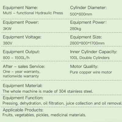 Este equipo de prensado industrial se especializa en procesos de deshidratación, extracción de jugo y desalinización para diversas aplicaciones de procesamiento de alimentos, incluyendo productos de frijol, vegetales encurtidos, materiales medicinales y verduras. El sistema también realiza la separación sólido-líquido para otros materiales resistentes a la extrusión, con un rendimiento que varía según las características del material.
