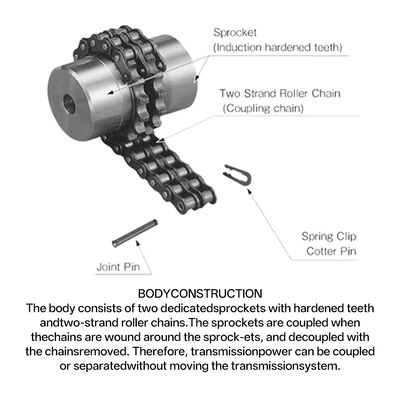 El núcleo consta de dos semiacoplamientos tipo piñón y una cadena de rodillos, a menudo equipados con una cubierta protectora. El cuerpo principal suele estar forjado de acero 45#, con la cadena y las superficies de los dientes sometidos a tratamiento de temple para mejorar la resistencia al desgaste y la durabilidad.